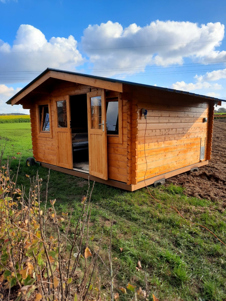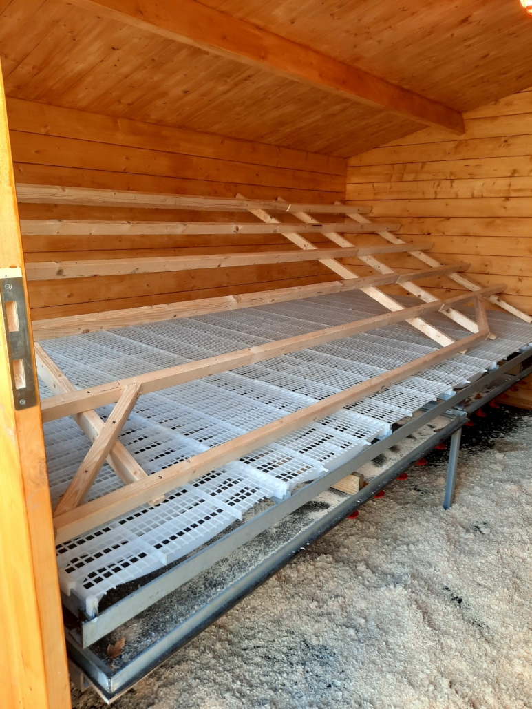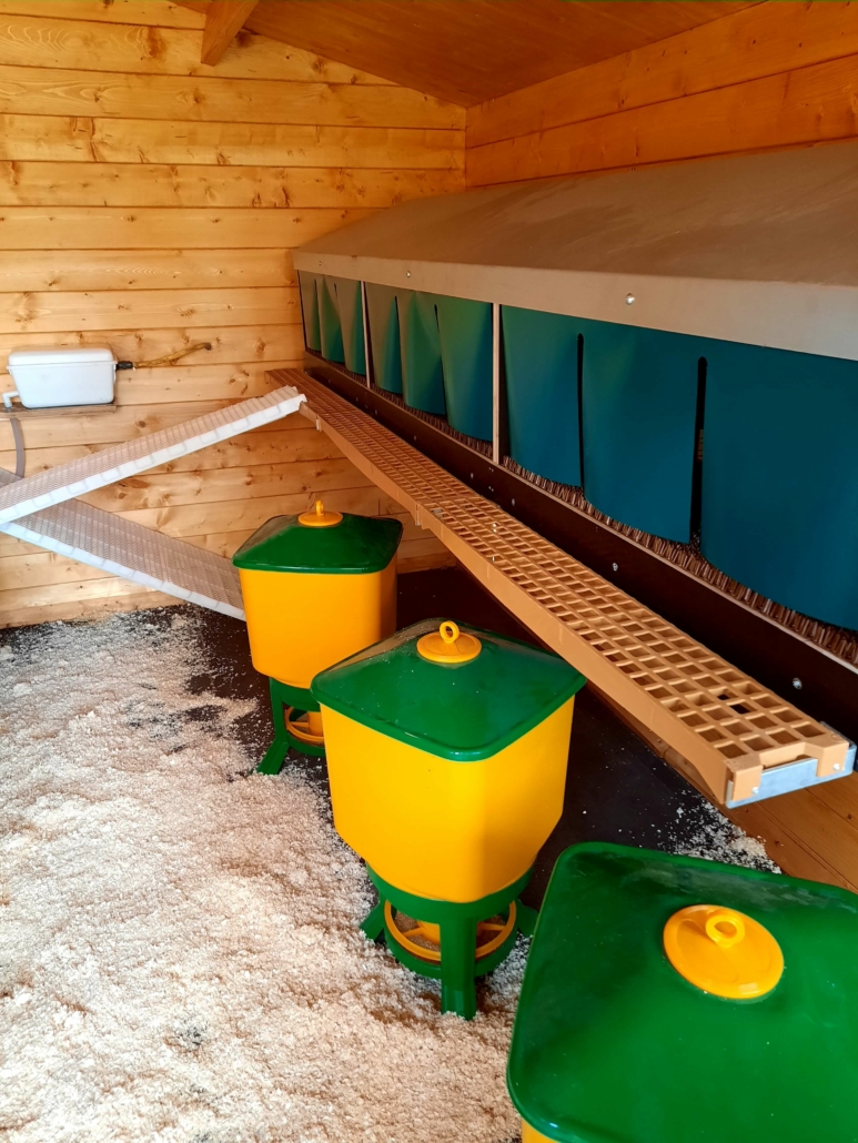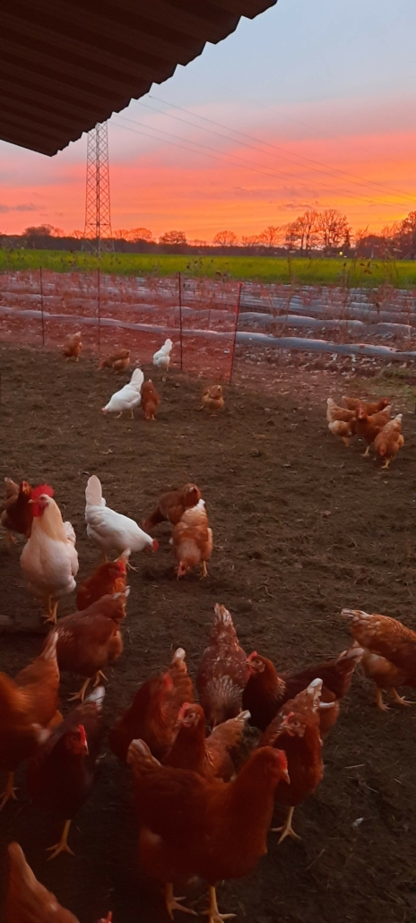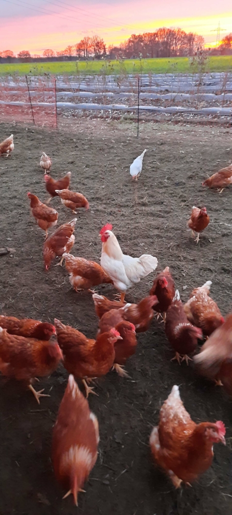 Zwei kleine Gruppen von Hühnern, jeweils etwa 100 braune und weiße Legehennen und ein Hahn als „Chef“, leben in Freilandhaltung auf einer Wiese direkt an unserem Hof. Selbstgebaute Mobilställe beherbergen sie nachts und bei schlechtem Wetter. Es macht Spaß, diese freundlichen Tiere zu beobachten.